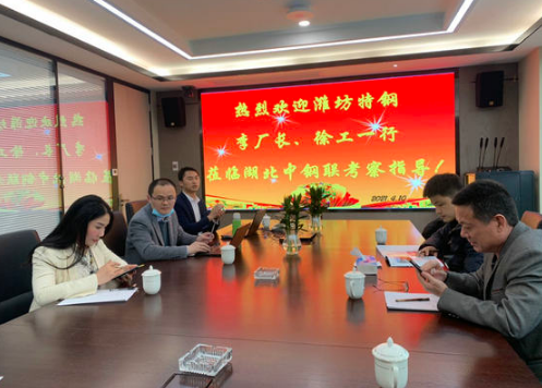 2021年4月11日山東濰坊特鋼廠長李炳亮及工程師徐培升一行2人到中鋼聯考察、調研。受符乃良董事長的委派,我司銷售副總經理沈燕、董事長助理劉助理負責接待。